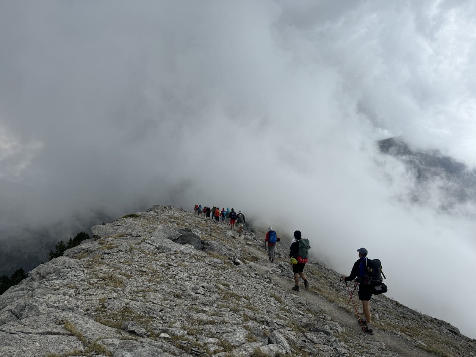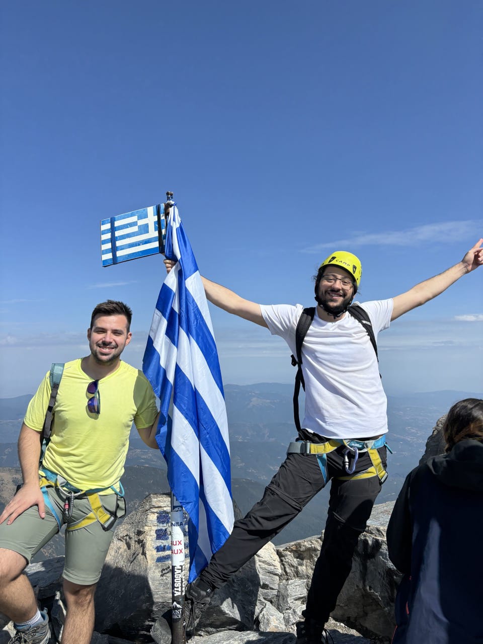 On the left, the neck of the mountain, where our hiking group was met with rain and fog. Middle, me and a dear friend on the summit, Mytikas. Right, the second highest peak, Stefani also known as the throne of Zeus.